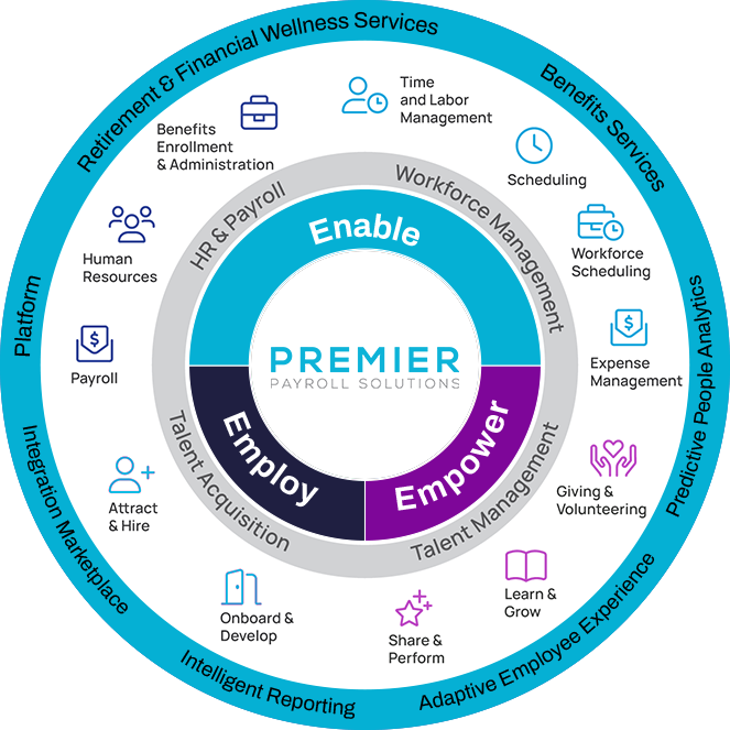 Premier Payroll’s People Cloud brings you and award-winning platform coupled with comprehensive benefits, HR, and legal services, ensures your business has everything it needs to manage and develop your employees, from hire to retirement.